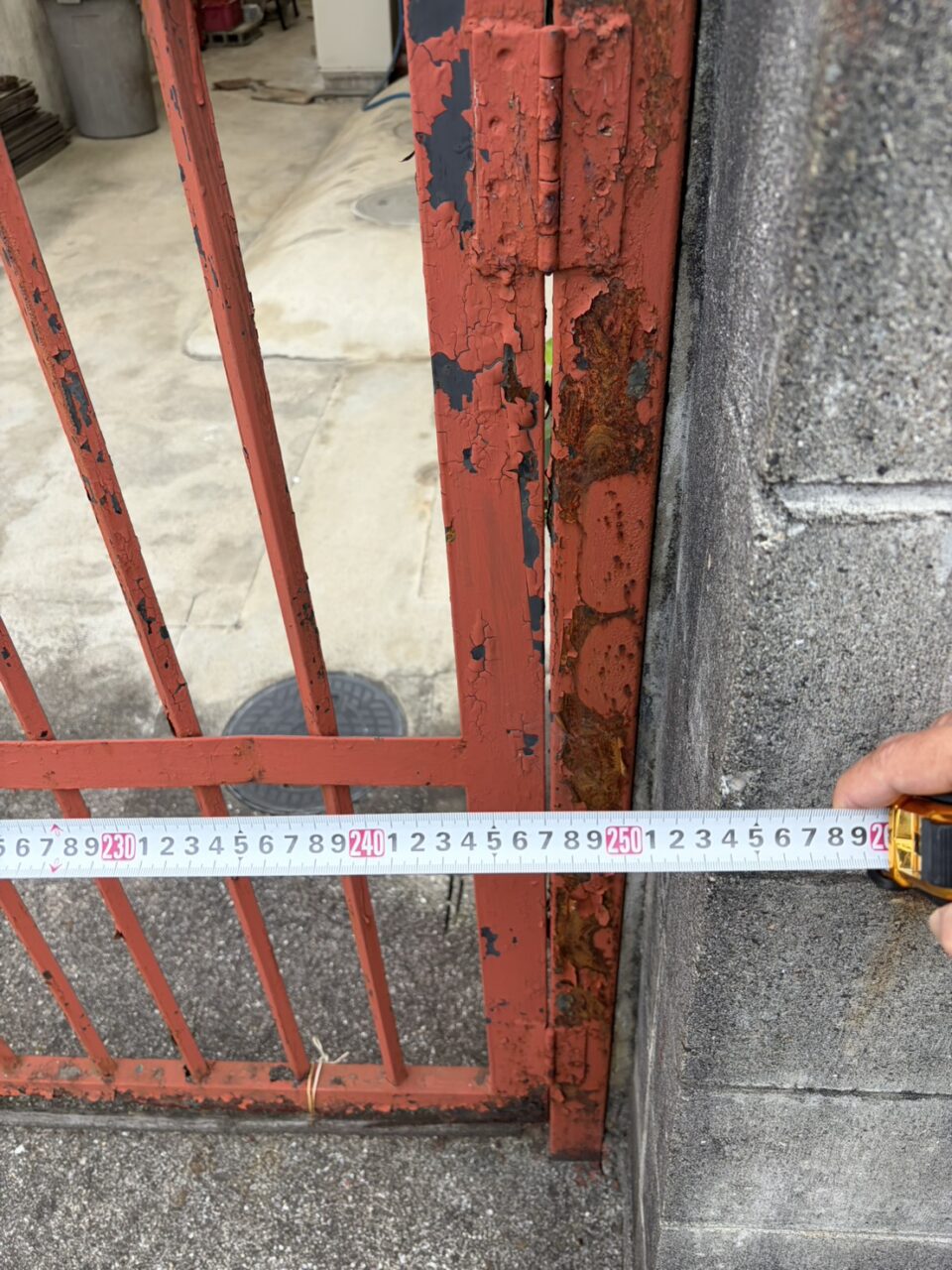 今回の採寸では、門扉の【開口幅】【高さ】【柱の太さ】【柱と柱の間隔】はもちろん、地面の勾配やコンクリートの状態、門扉の開閉方向まで確認しました。さらに、扉を開けたときに干渉するものがないか、敷地内外の動線もチェックしています🚶♂️こうした細かな確認が、使いやすく長持ちする門扉交換につながります✨