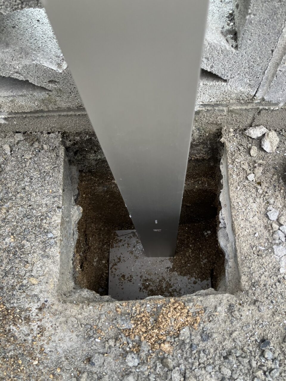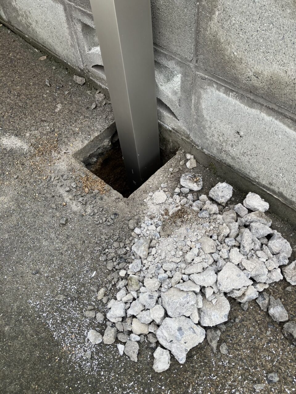 コンクリートを四角くカットし、アルミ柱を垂直に設置。